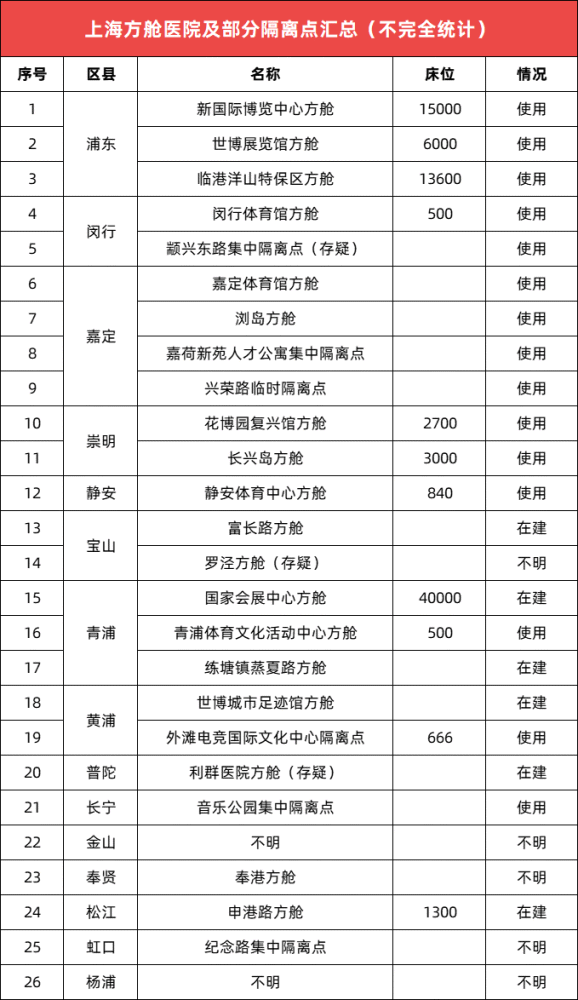 8日,上海日增本土病例(確診+無癥狀)已破兩萬。在抗疫最緊要關頭,登上老百姓關注排行榜榜首的,非以下兩個問題莫屬。一個是確診和密接是否能及時轉運;一個則是居家隔離抗疫是否能有民生保障。毋庸置疑,在上海抗疫方針不斷調整變化的形式下,政府如何解決病床缺口讓普通老板姓也擔憂不已。社交平臺上我們經常能看見的、曝光較為頻繁的以世博方艙、新博覽會展方艙為代表的浦東方艙陣營,因最早加入抗疫前線,公眾較為熟悉。那么放眼整個上海,還有哪些方艙隔離點呢?CEIDI西遞根據網絡上不完全統計,將上海區域隔離點匯總如下: